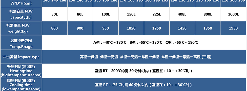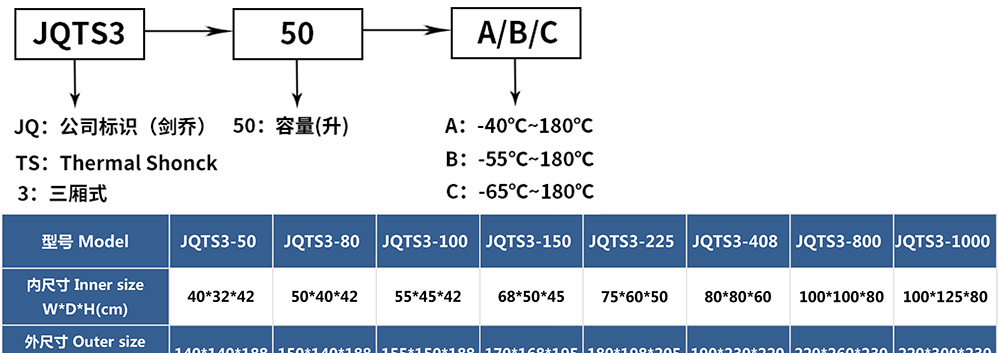 三廂式冷熱沖擊試驗(yàn)箱型號(hào)命名及參數(shù)表