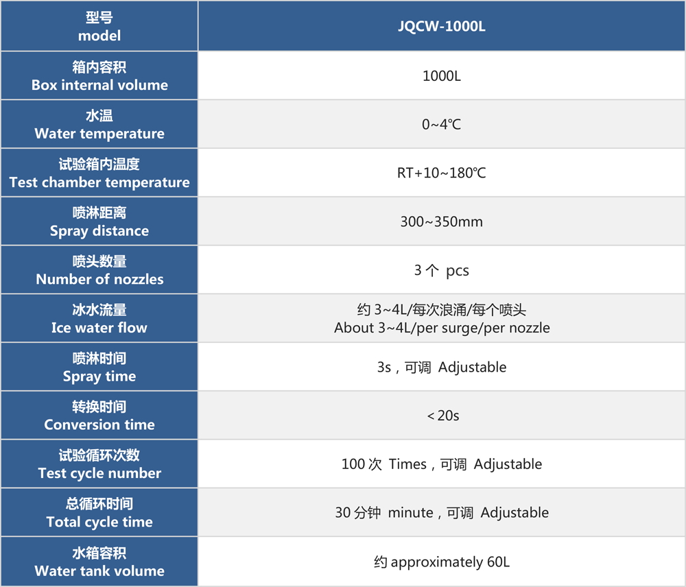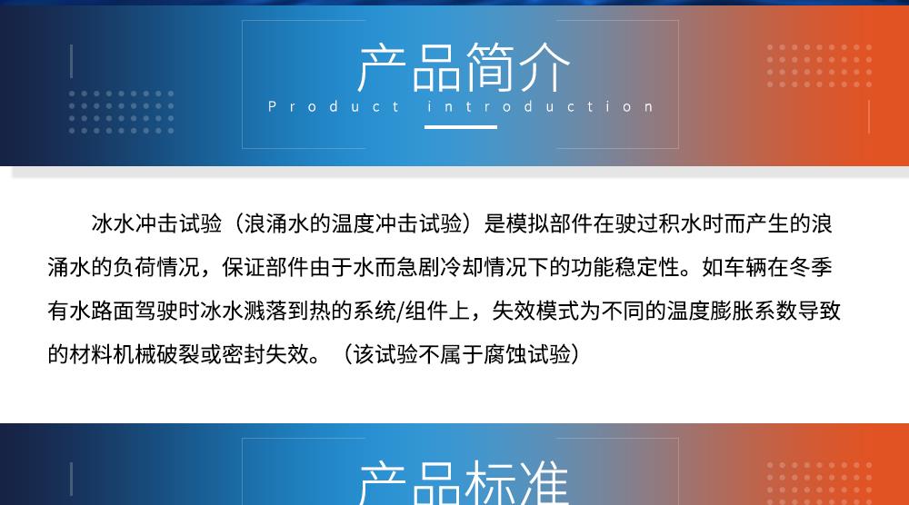 用途:冰水沖擊試驗(浪涌水的溫度沖擊試驗)是模擬部件在駛過積水時而產生的浪涌水的負荷情況,保證部件由于水而急劇冷卻情況下的功能穩定性。如車輛在冬季有水路面駕駛時冰水濺落到熱的系統/組件上,失效模式為不同的溫度膨脹系數導致的材料機械破裂或密封失效