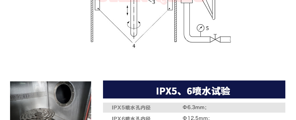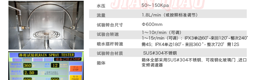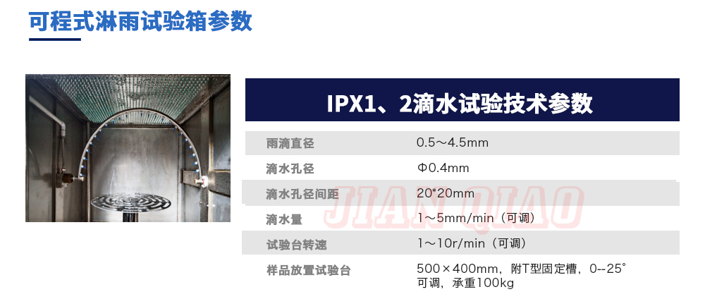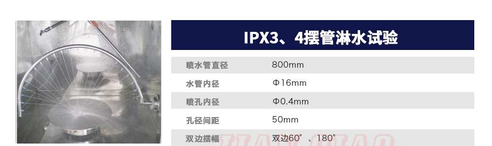 用途:可程式淋雨試驗箱適用于電工電子產品(包括組件)、燈具照明產品、汽車摩托車零部件外殼和密封件等產品做外殼防護等級測試(IP 防水等級試驗),模擬其產品在運輸和使用期間可能受