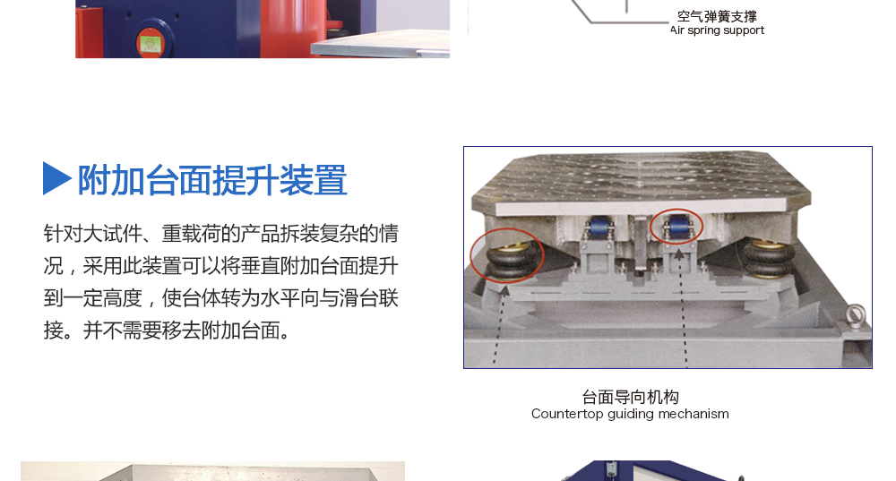 用途:擴展臺面是否需要輔助支撐與導向裝置,取決于用戶產品試驗的重量和偏載情況。劍喬公司提供不同規格的承載氣囊及不同形式的導向裝置。配備輔助支撐和導向裝置可以大大提高設備的承載能